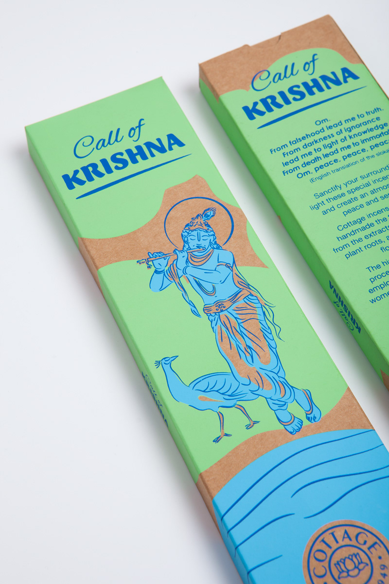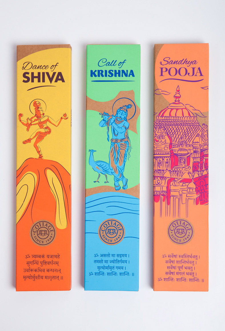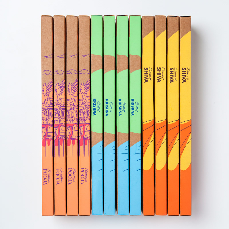 A vibrant and artistic range of packaging designed for a series of premium incense. The three artisanal incense variants are themed after Lord Shiva, Lord Krishna and the ceremonious temples of India, paired with Sanskrit shlokas. A hand-painted appeal with flowing lines and glowing colours.