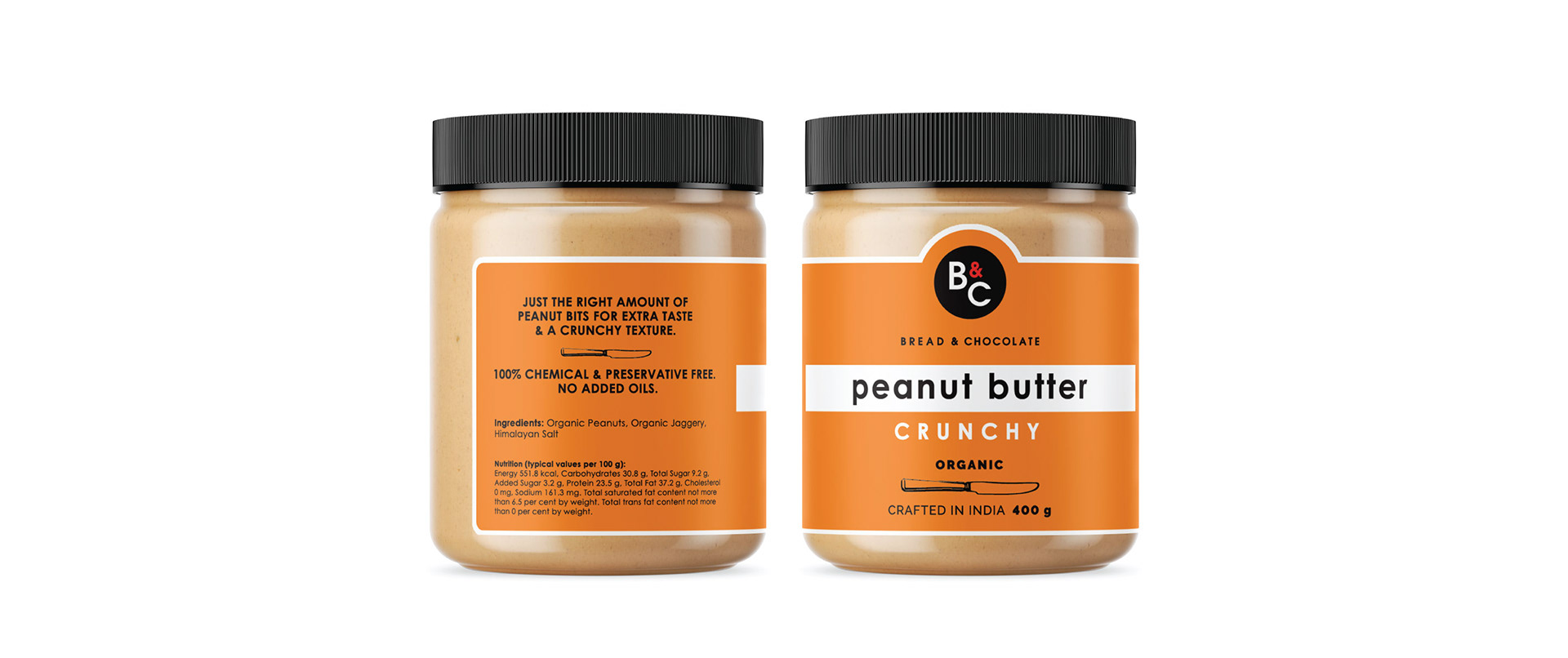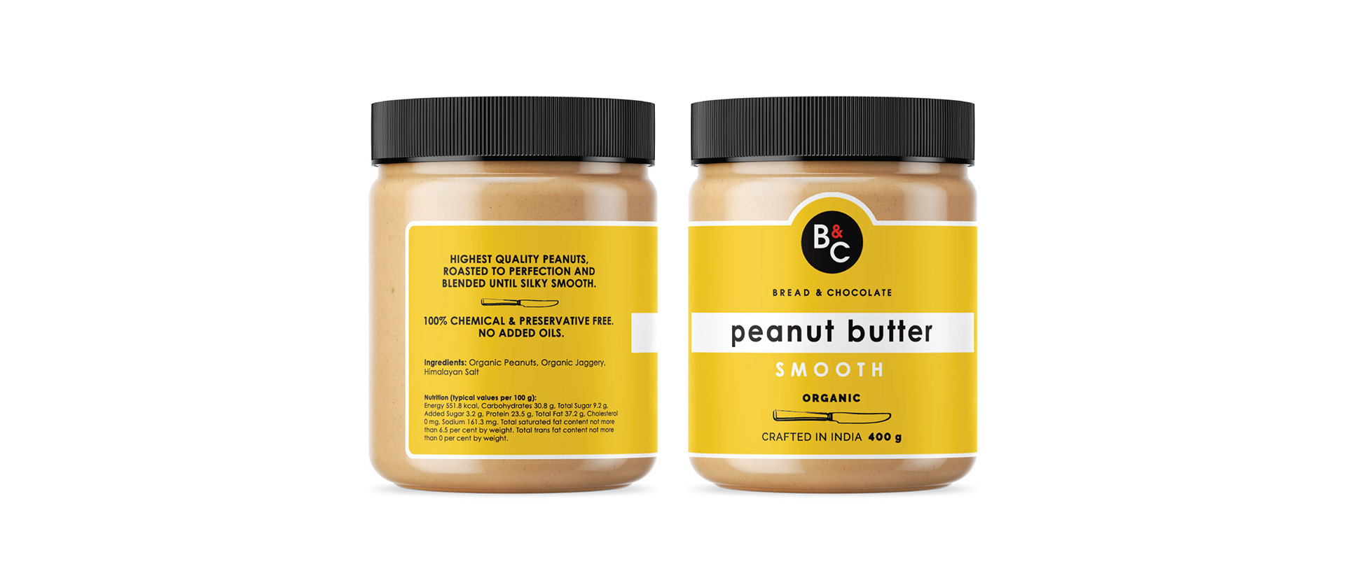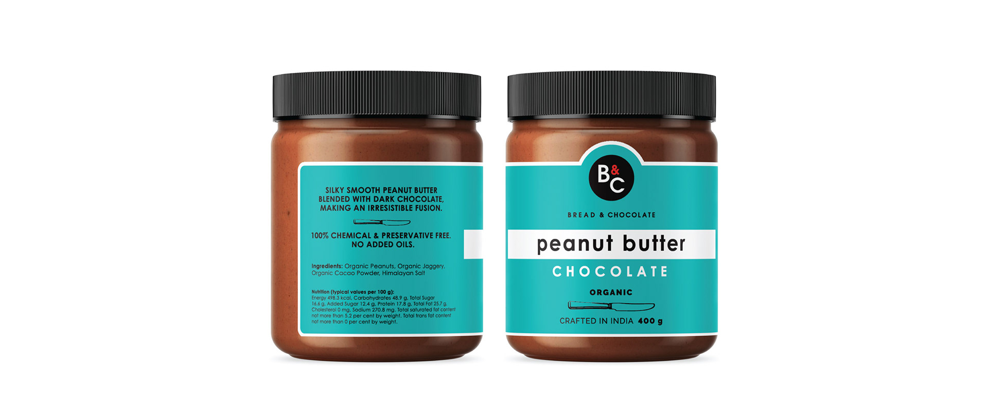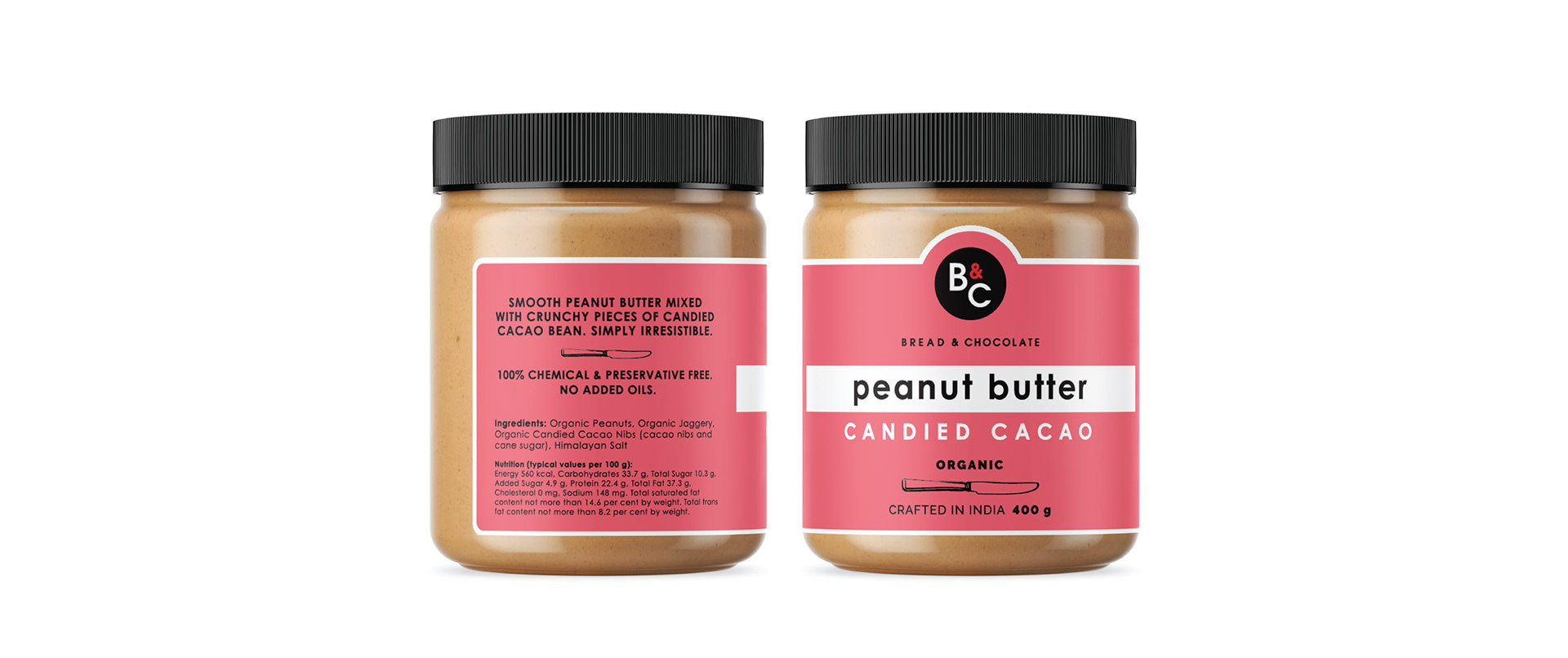 Identity design for Bread & Chocolate, Auroville. Packaging design system for their range of peanut butters.