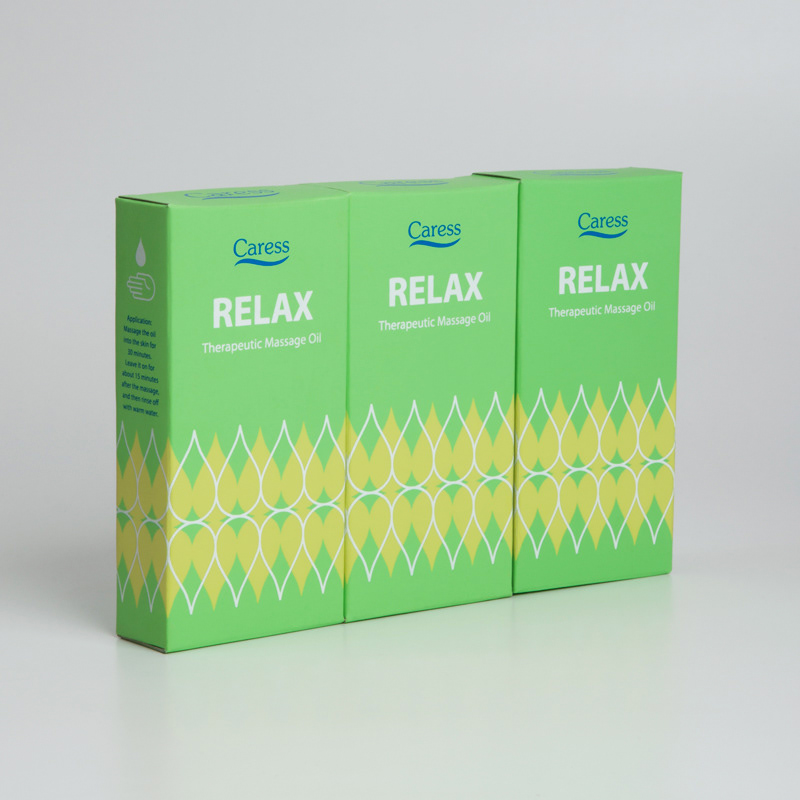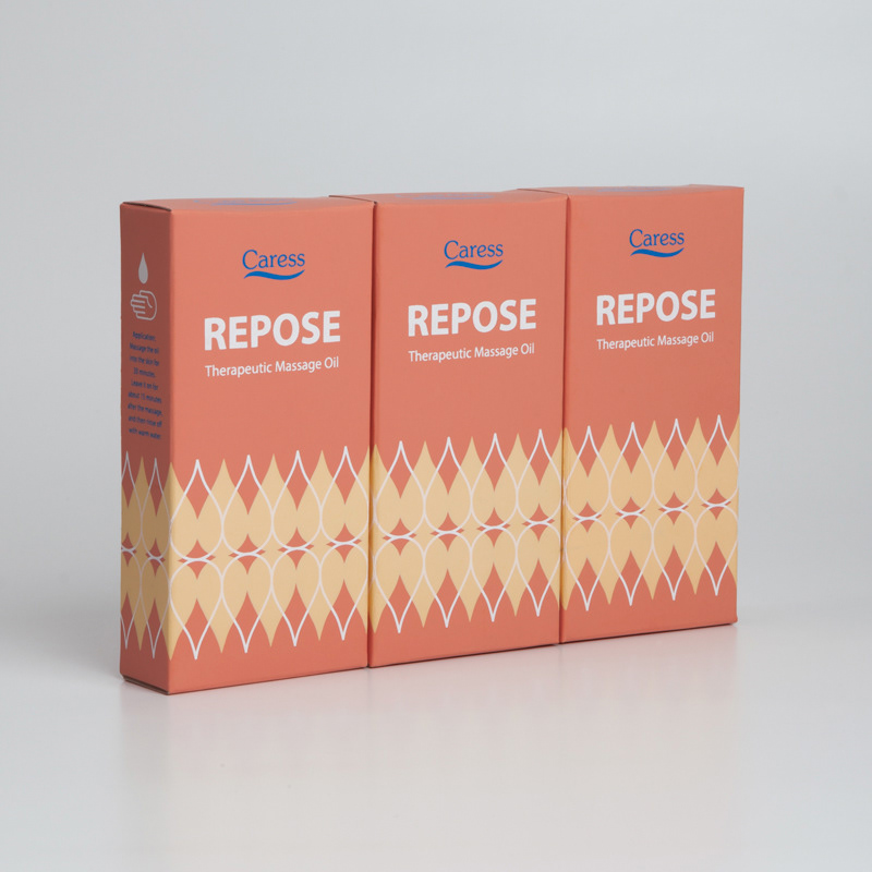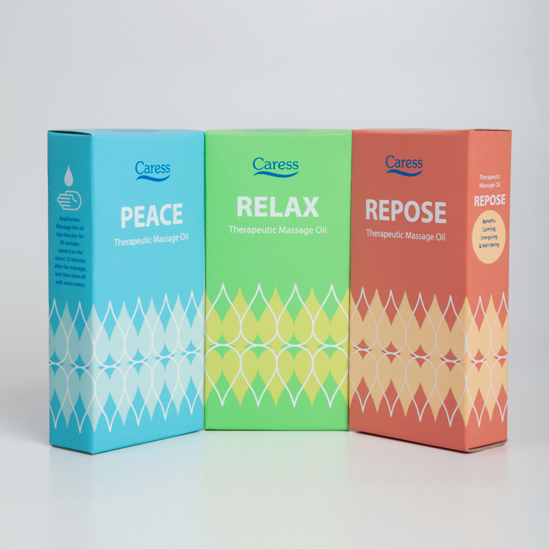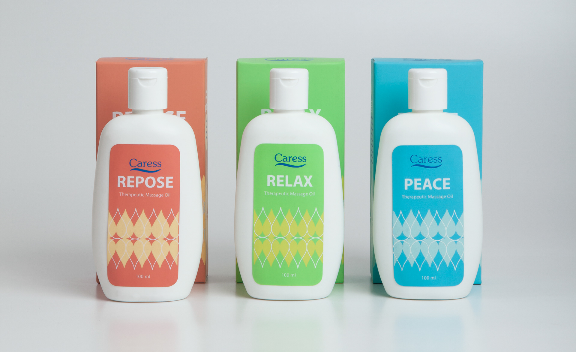 Packaging design for a range of soothing massage oils by Cottage Industries. A simple and sober design inspired from the form of a drop of oil.