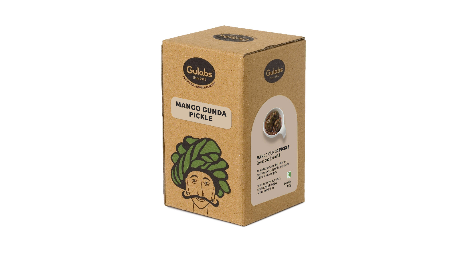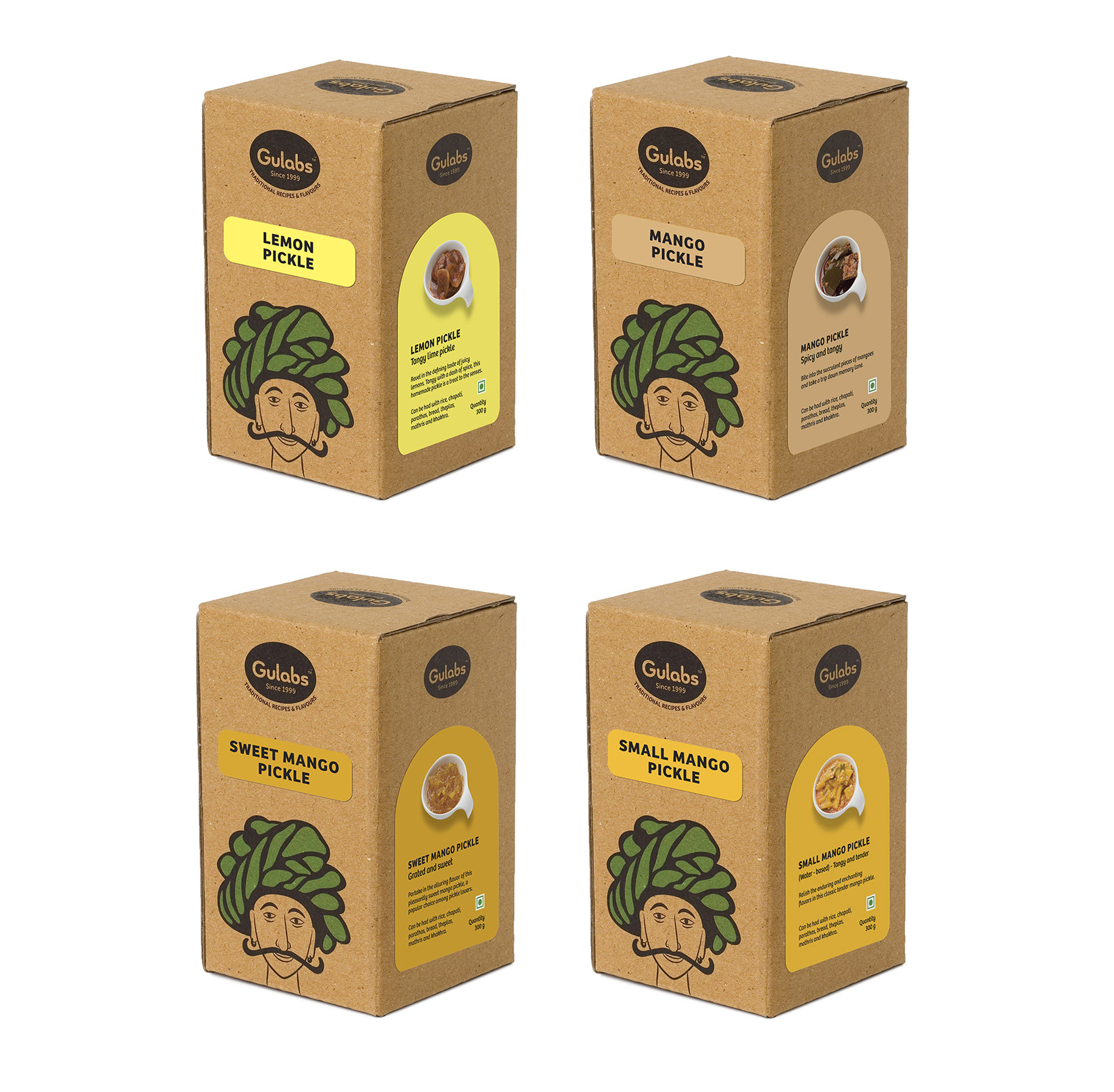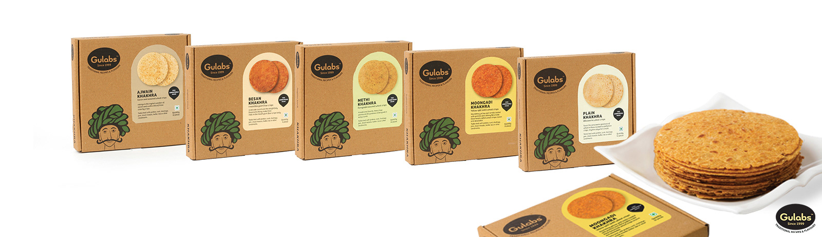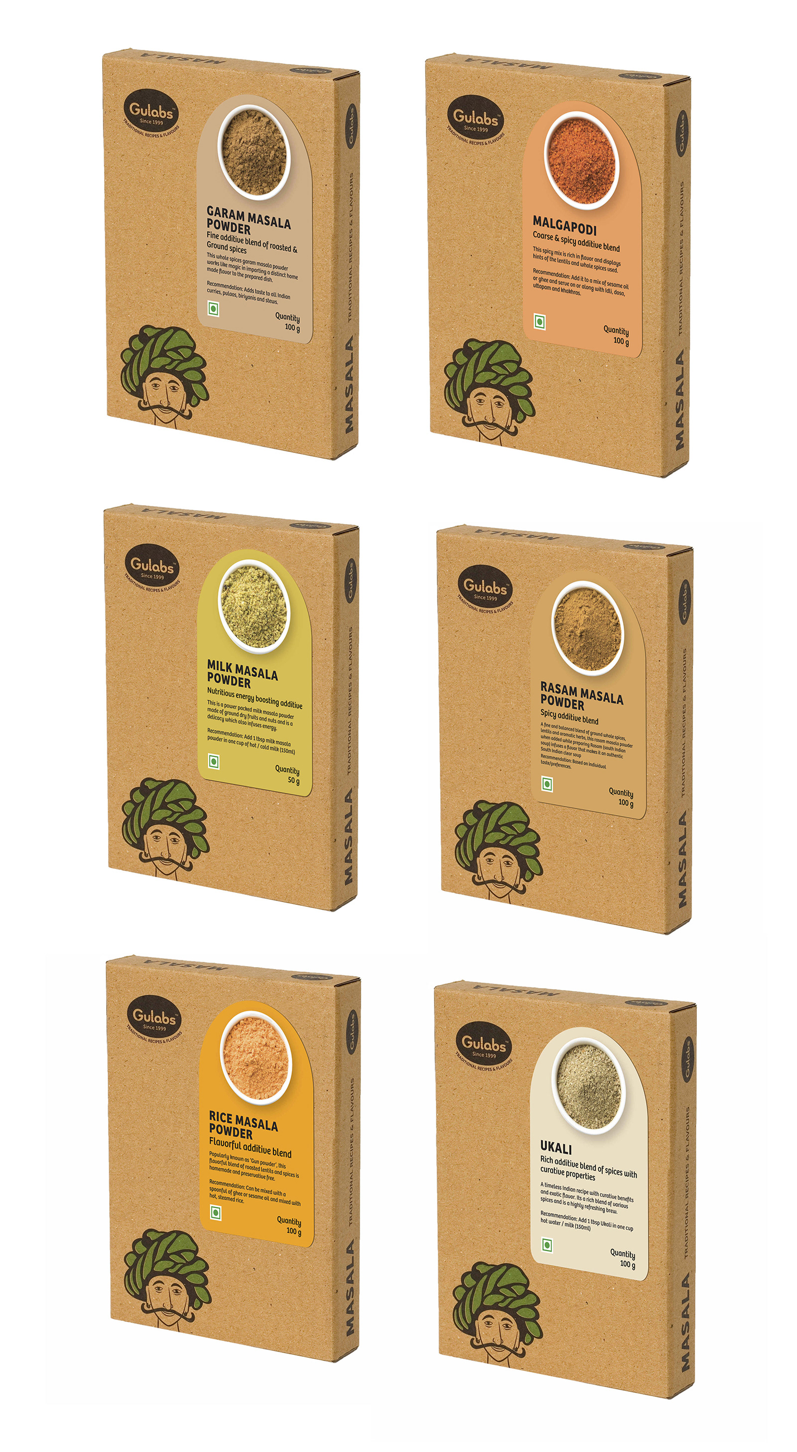 Identity design and packaging design system for Gulabs; a range of small-scale Indian food products (snacks, condiments and spices). Positioned at shoppers in Indian supermarkets, this is an ethnic, kitschy and earthy brand that promises products with a traditional taste.