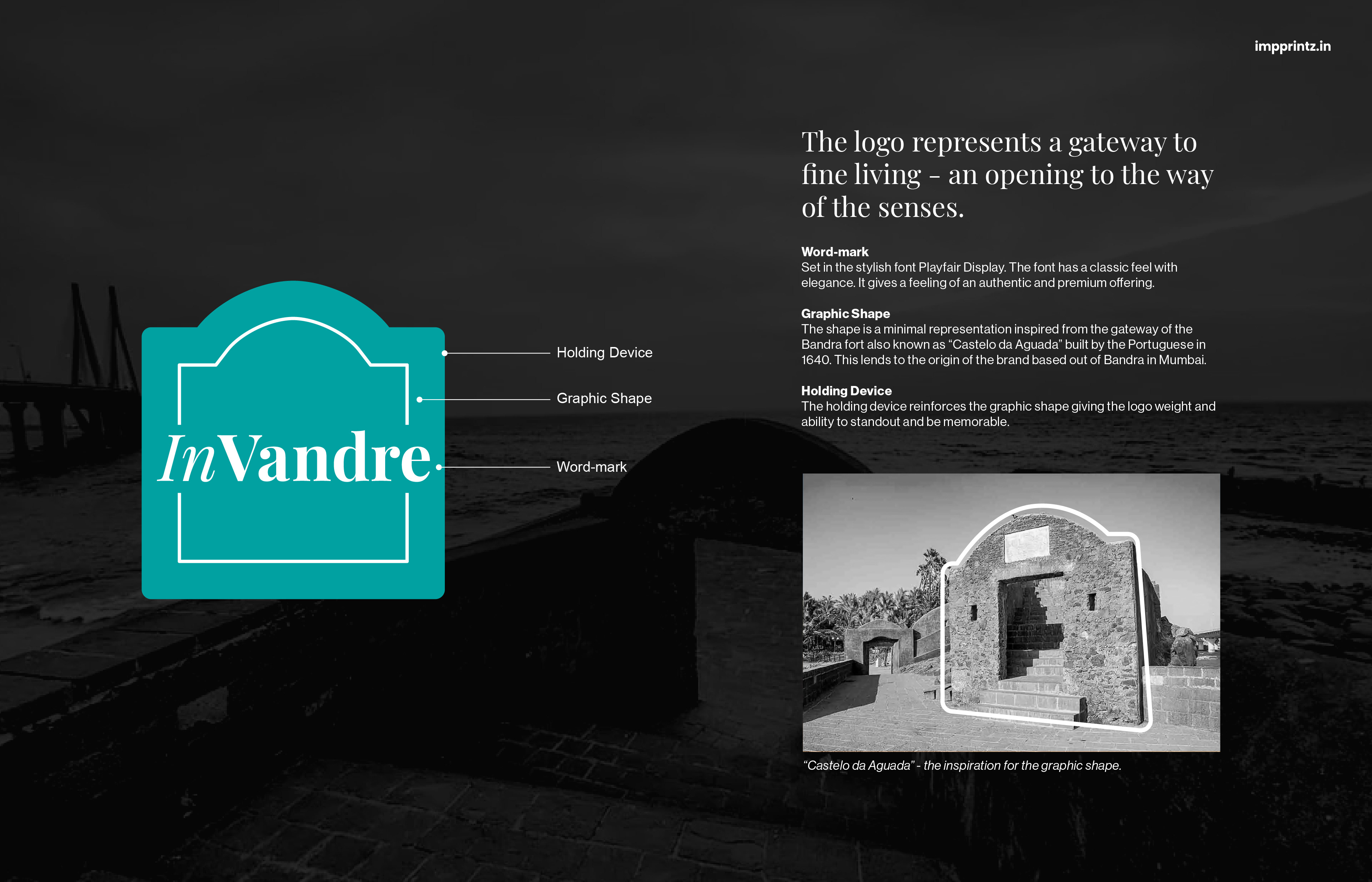 Impprintz looked into the historical locations that defined Bandra and which could lend itself visually to the identity. The old Portuguese fort "Castelo da Aguada" stands at the southernmost tip of the peninsular strip of land that juts into the Arabian Sea. The tall entry to the fort stood out with its distinct shape. "The gateway" resonated well as a concept for the brand offering luxurious products for the sense of smell. The sense of smell is often considered a gateway to emotion and memory.