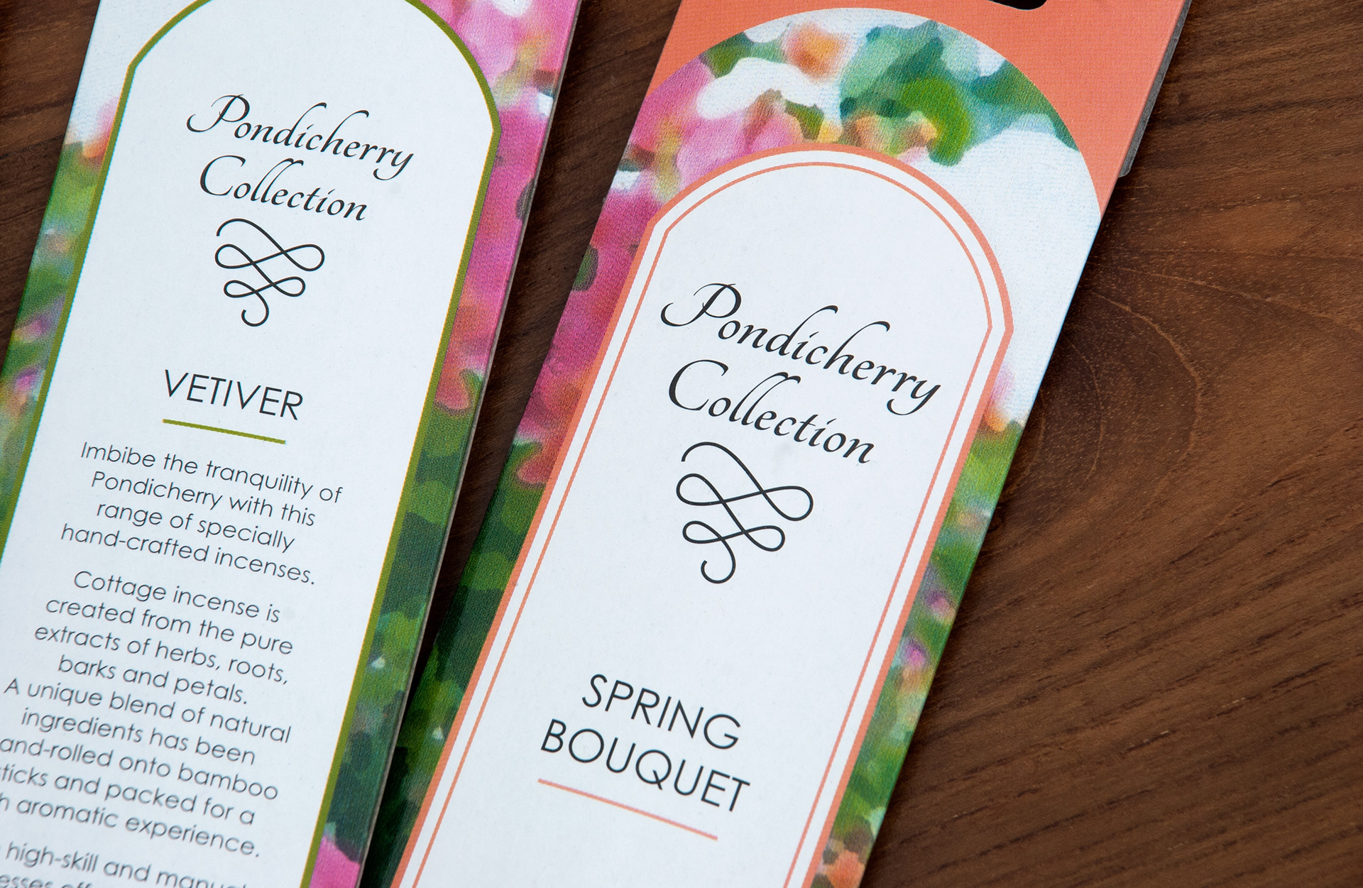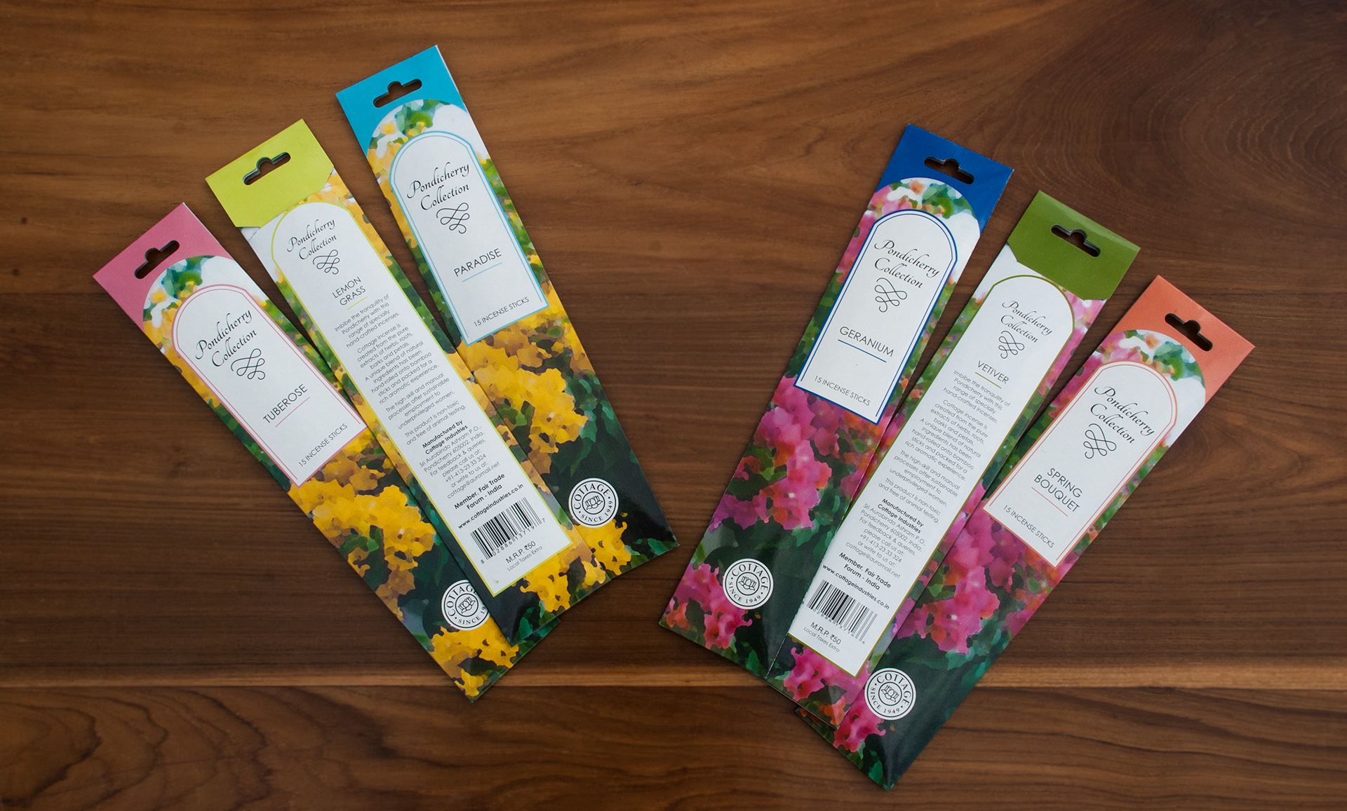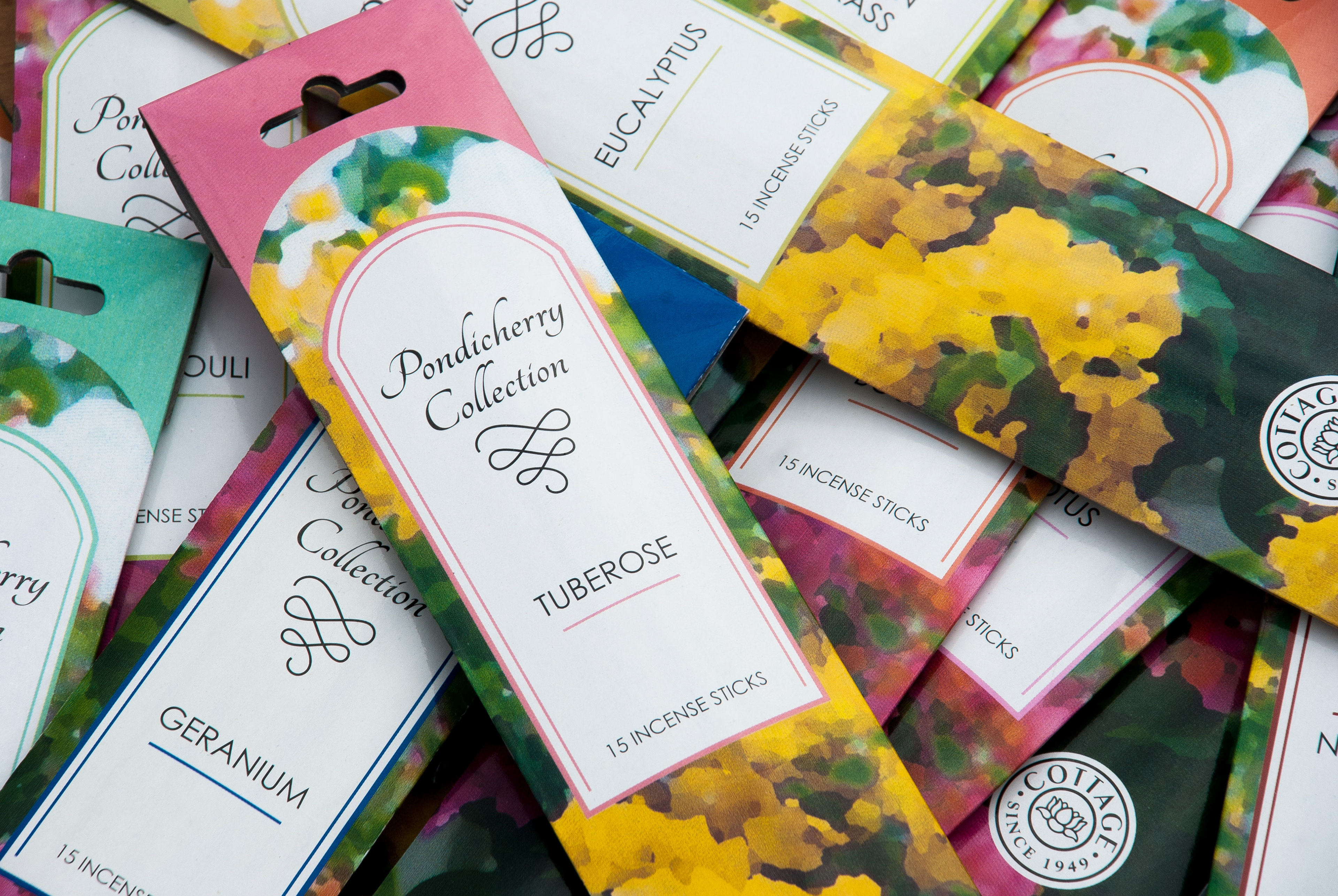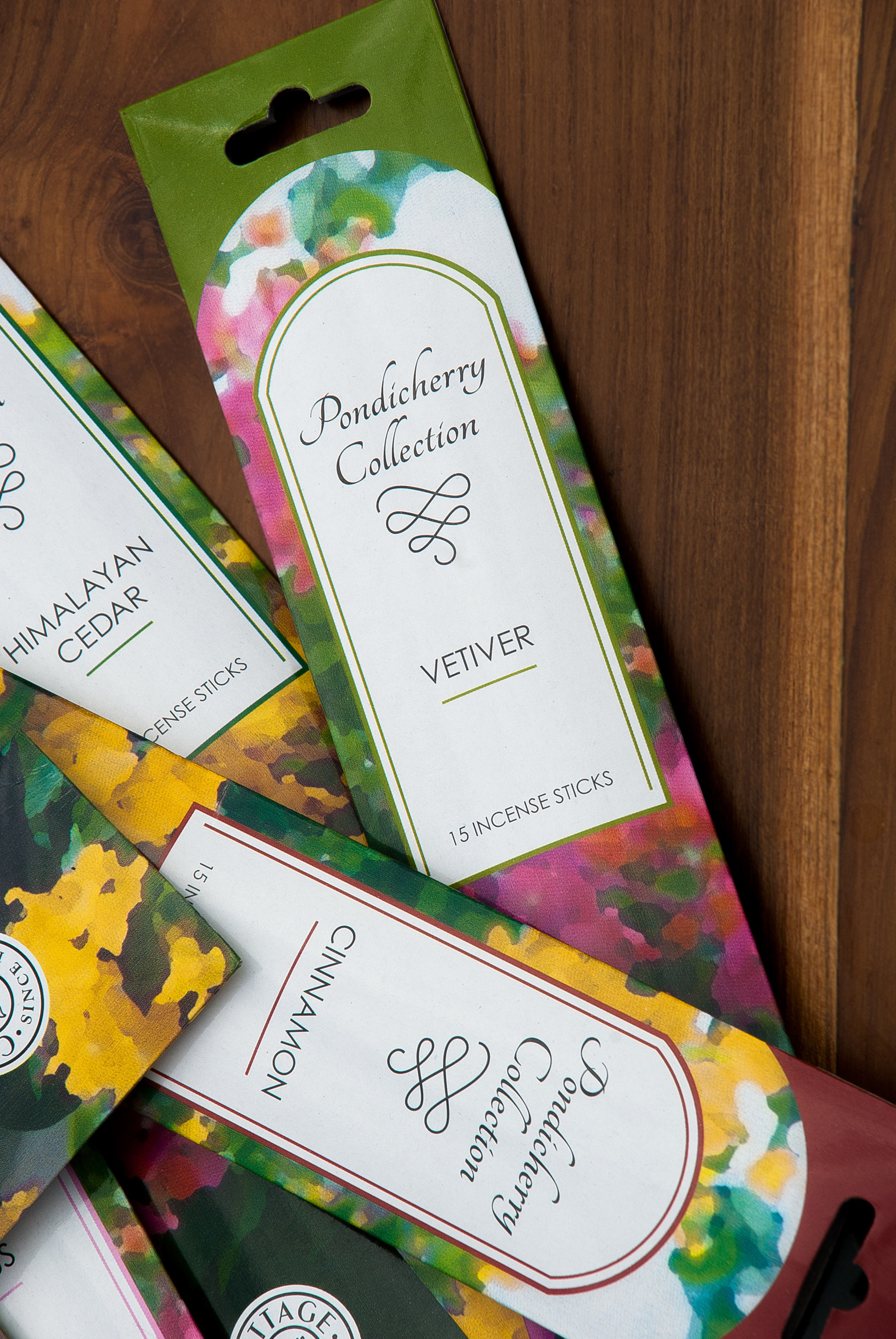 Packaging design inspired from the French heritage town of Pondicherry, for the 'Pondicherry Collection' range of incense, by Cottage Industries.