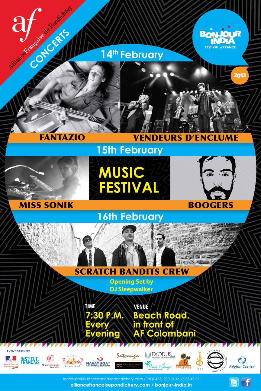 Promotion design for the Bonjour India Festival 2013, commissioned by Alliance Française de Pondichéry.