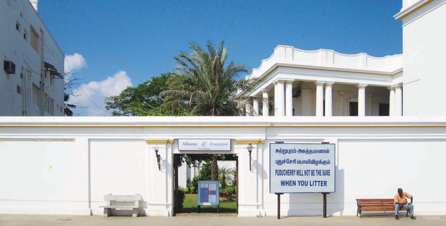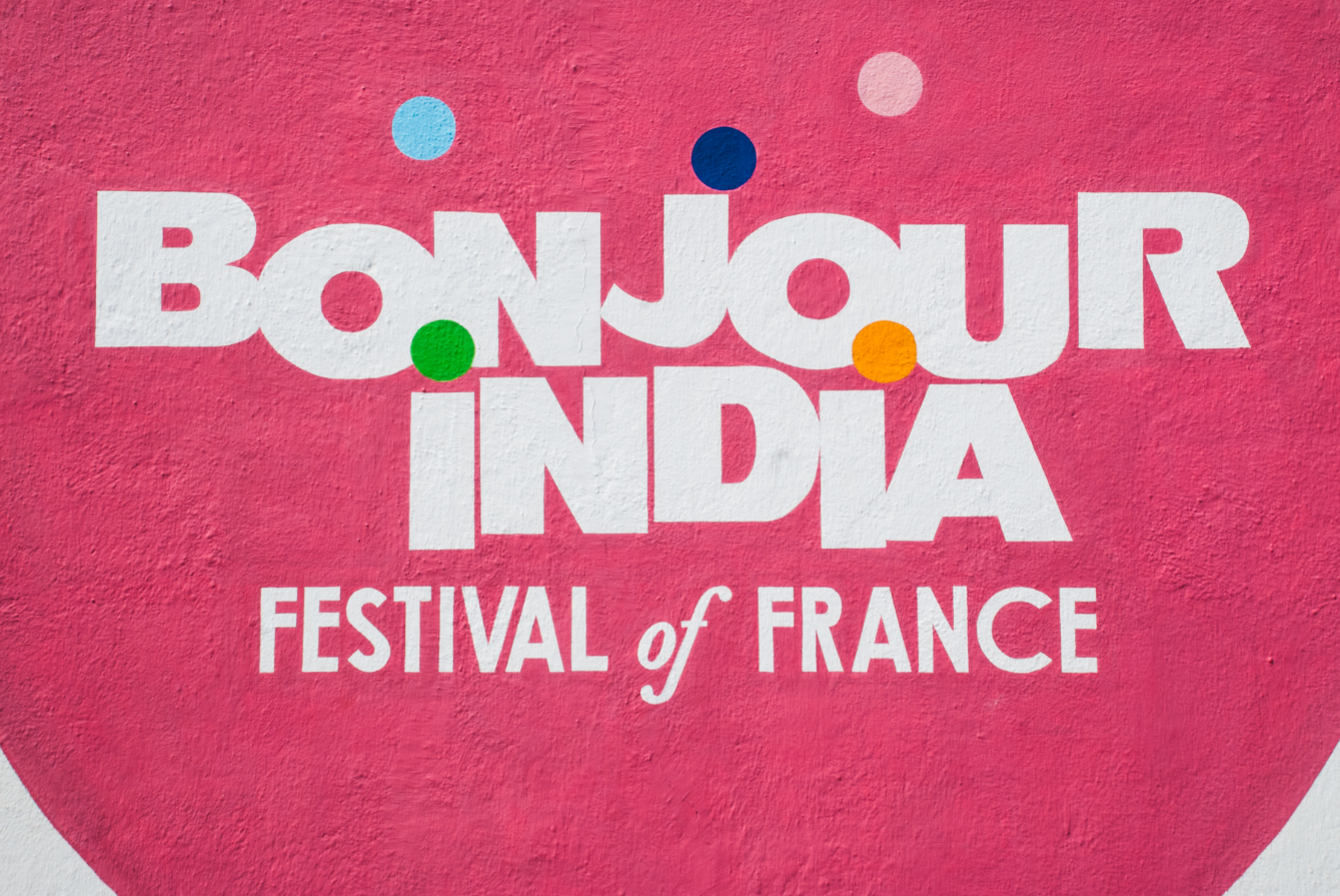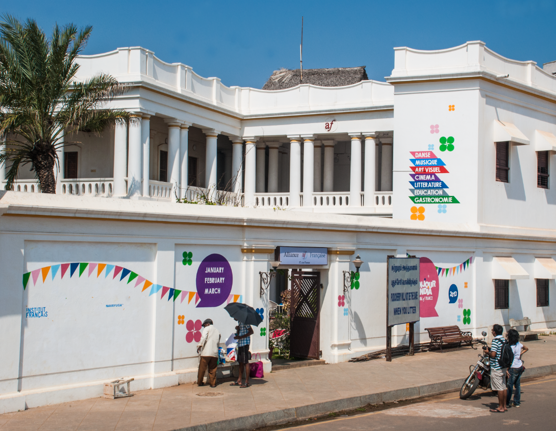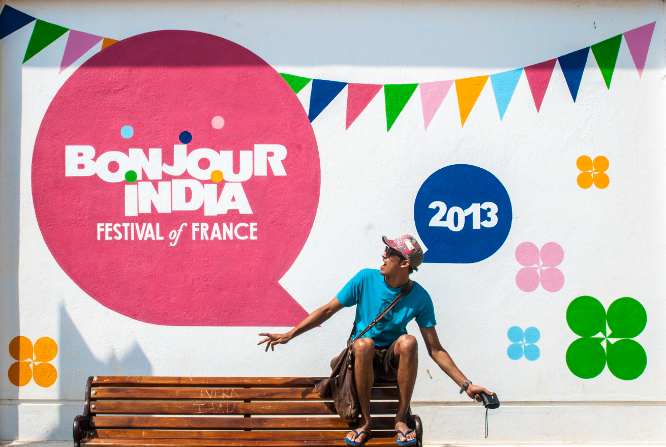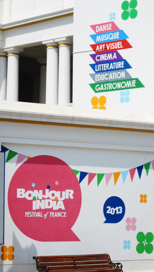The Alliance Française of Pondicherry commissioned Impprintz to create a mural on their building exterior to promote awareness and excitement about the upcoming Bonjour India Festival 2013, in Pondicherry.