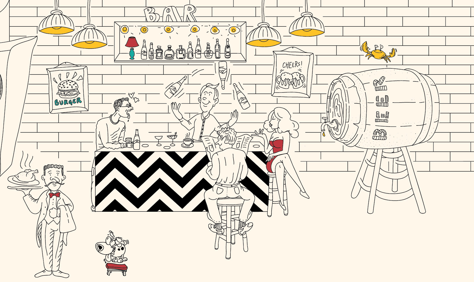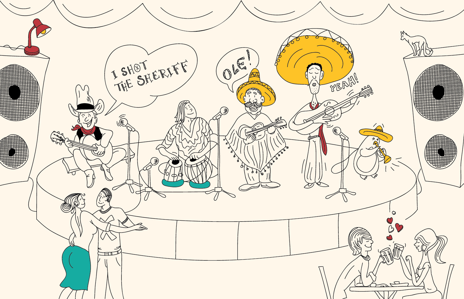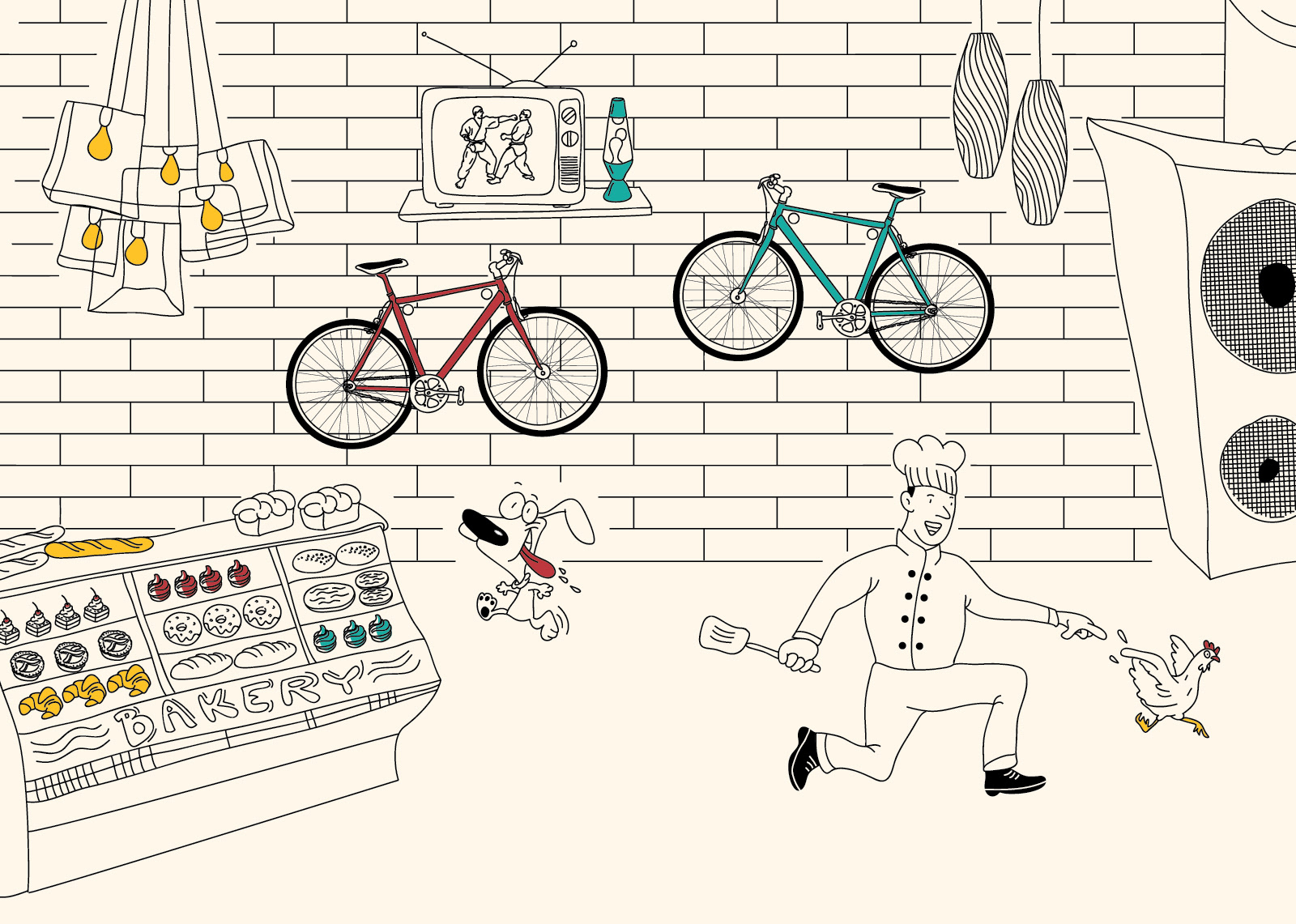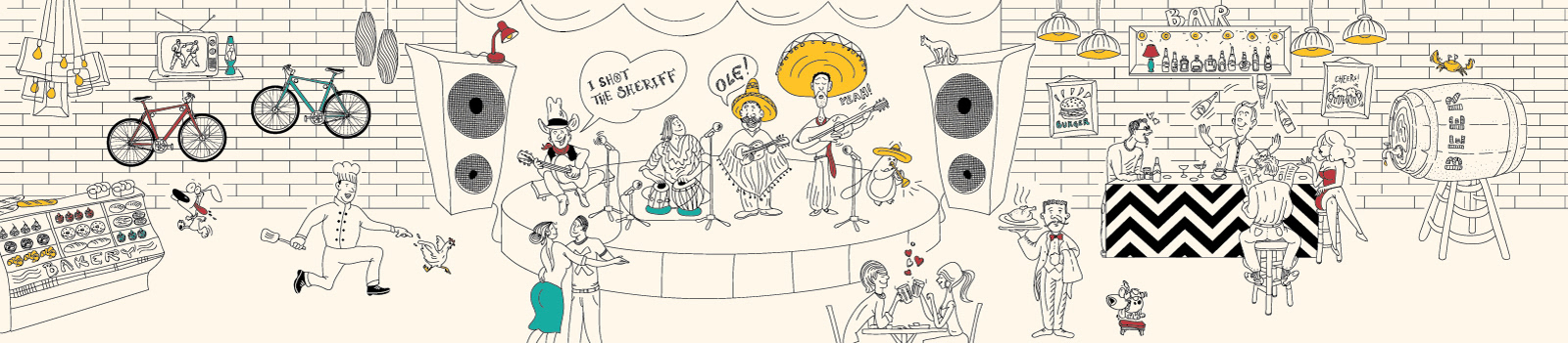 Illustrated mural for the central wall at Where Else Cafe (Pune, India), measuring 40 ft x 8 ft.
